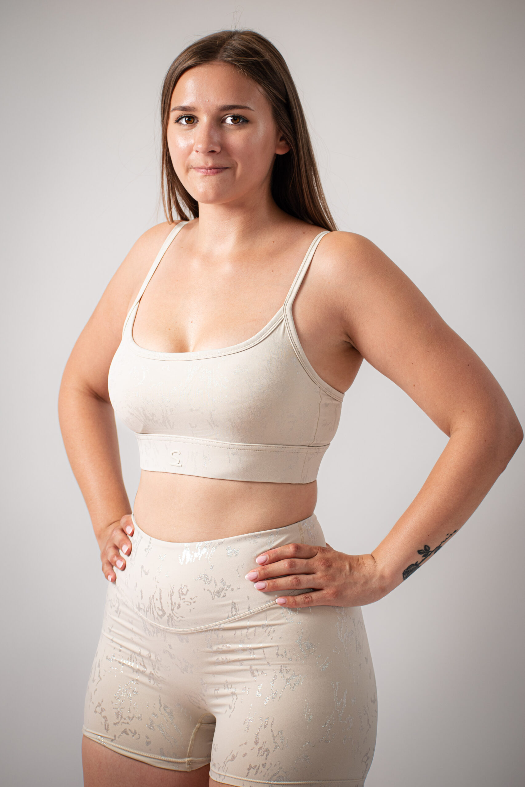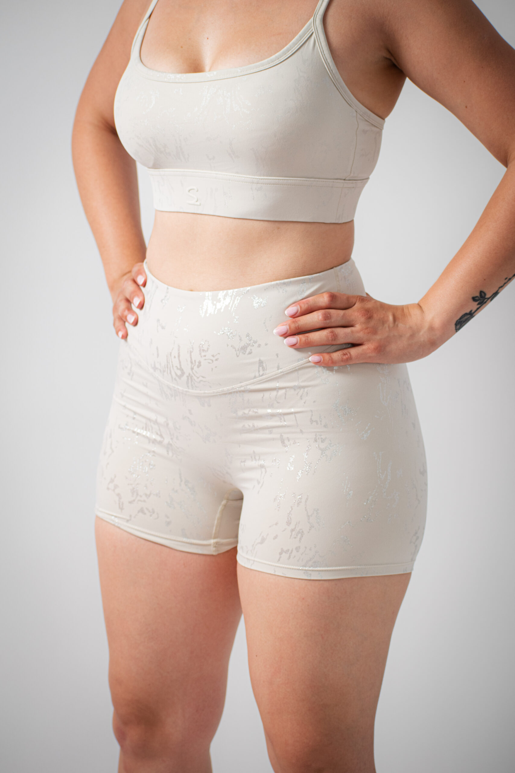 Elevess kratke hlače, ki združujejo estetsko popolnost in izjemno funkcionalnost. Izdelane iz lahkotnega, zračnega materiala, ki je na otip tako mehak, da spominja na žamet. Ko jih primeš, veš, da držiš nekaj posebnega. Ko jih oblečeš, se prilegajo telesu kot ulite – brez šivov, brez draženja, brez nepotrebnih detajlov.